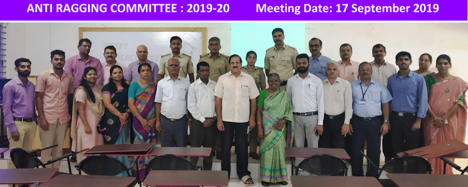 Meeting of Anti-Ragging Committee was held on 17 September, 2019 at 10:30 a.m. in the Audio Visual Hall. Mr Sridhar Nambiar, Police sub inspector, Manipal police station ws present. Addressing the members of the committee he said, Ragging committees in the colleges have to work effectively to curb the menace of ragging.