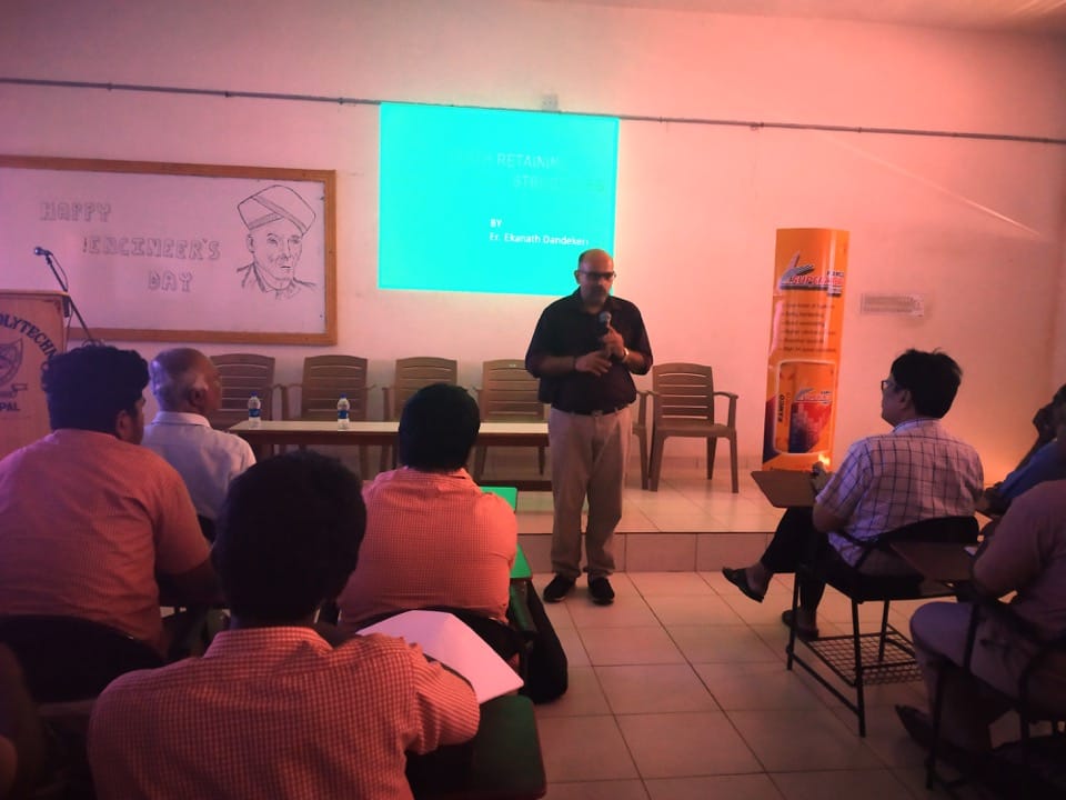 As part of “TECHNOWEEK”, Association of consulting civil Engineers, Mangalore centre and RAMCO cements Limited in association with civil engineering department of Dr.T.M.A.Pai Polytechnic, Manipal organised a technical talk on “Basics of concrete and Retaining walls” on 20-09-2019. Er. Anil Baliga and Er. Ekanath Dandakeri were the resource persons. Principal Mr T Narendra Pai, Vice Principal Mr Prashanth Shetty P, H.O.D of Civil Engg Mr. Doreswamy K were present. Student of civil engineering department participated in the programme.